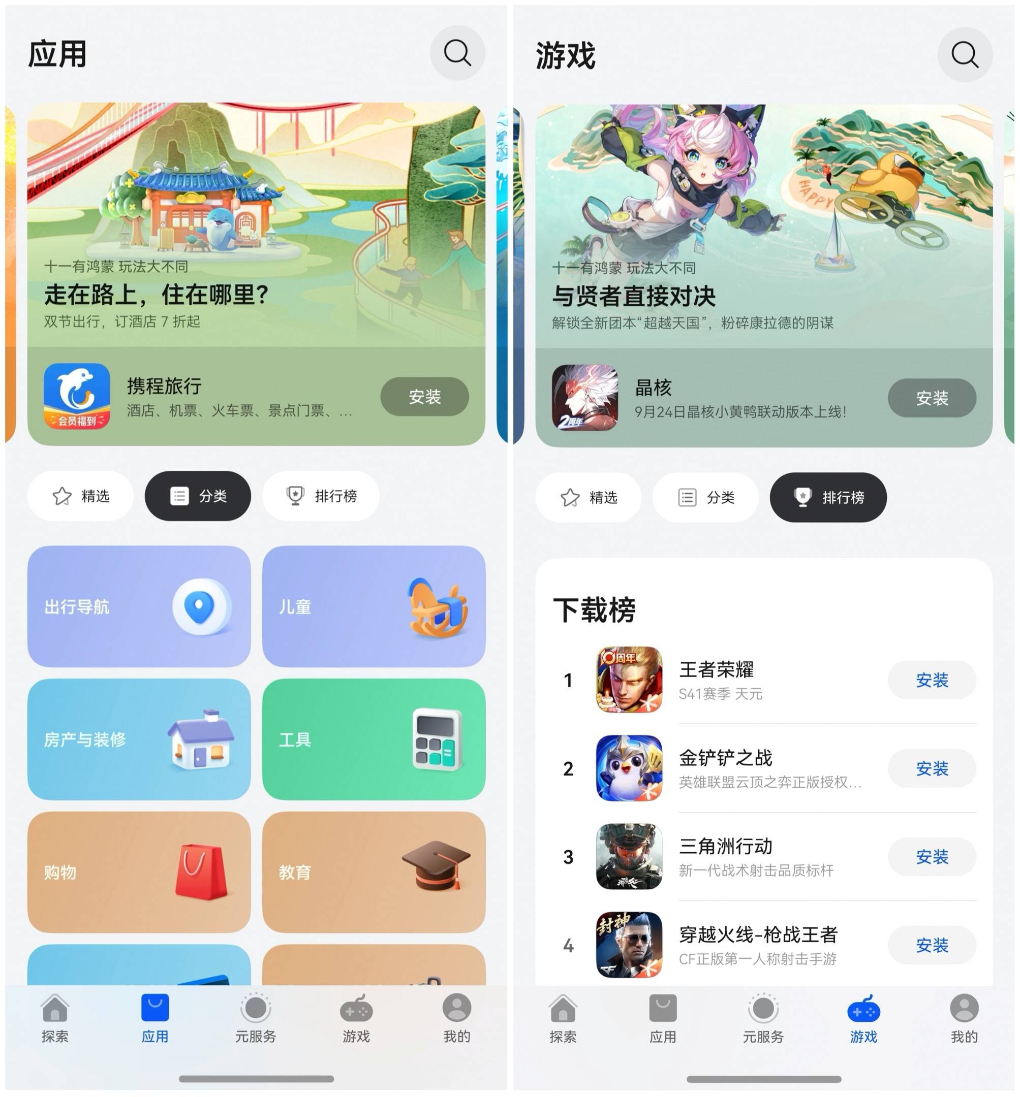 你可以在AppGallery的“应用”或“游戏”页探索,点击腰部的“分类”,进入效率、工具、动作射击、角色扮演等类别,探索更多同类应用和游戏。在“排行榜”类别,到“下载榜”看人气,“口碑榜”感受评价,发现更多宝藏App。