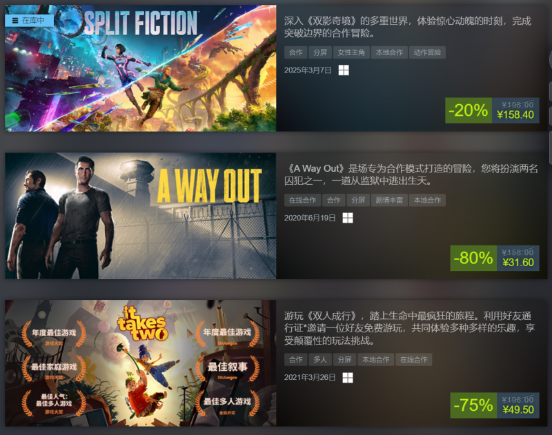 大促期间,另外两款来自 Hazelight 工作室的优秀合作游戏也将参与促销!即刻购买《逃出生天》立享二折优惠,你将扮演一名囚犯,与另一名囚犯一起逃出监狱。一开始紧张刺激的越狱计划,却转瞬间发生出人意料的转折,带来一段前所未见、情感交织而难以捉摸的冒险。即刻购买《双人成行》立享二五折优惠,踏上专为二人合作游玩打造的疯狂之旅。你们将扮演科迪和小梅携手闯关,在每个新关卡中掌握独特且彼此关联的角色技能。