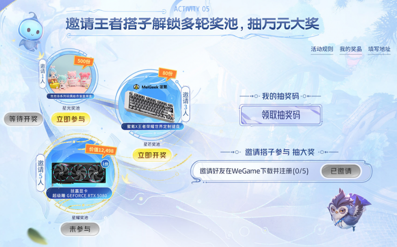 ● 顶级显卡抽奖:近期显卡市场价格飙升,《王者荣耀世界》WeGame筹备了专门的邀请抽奖活动,帮助玩家获得心仪的战斗装备。玩家邀请好友下载注册,即有机会抽取豪华万元奖池,核心奖品包含:技嘉5080超级雕显卡(GEFORCE RTX 5080)、大疆Pocket 3、AirPods 4、王者荣耀世界定制键盘及王者盲盒等。